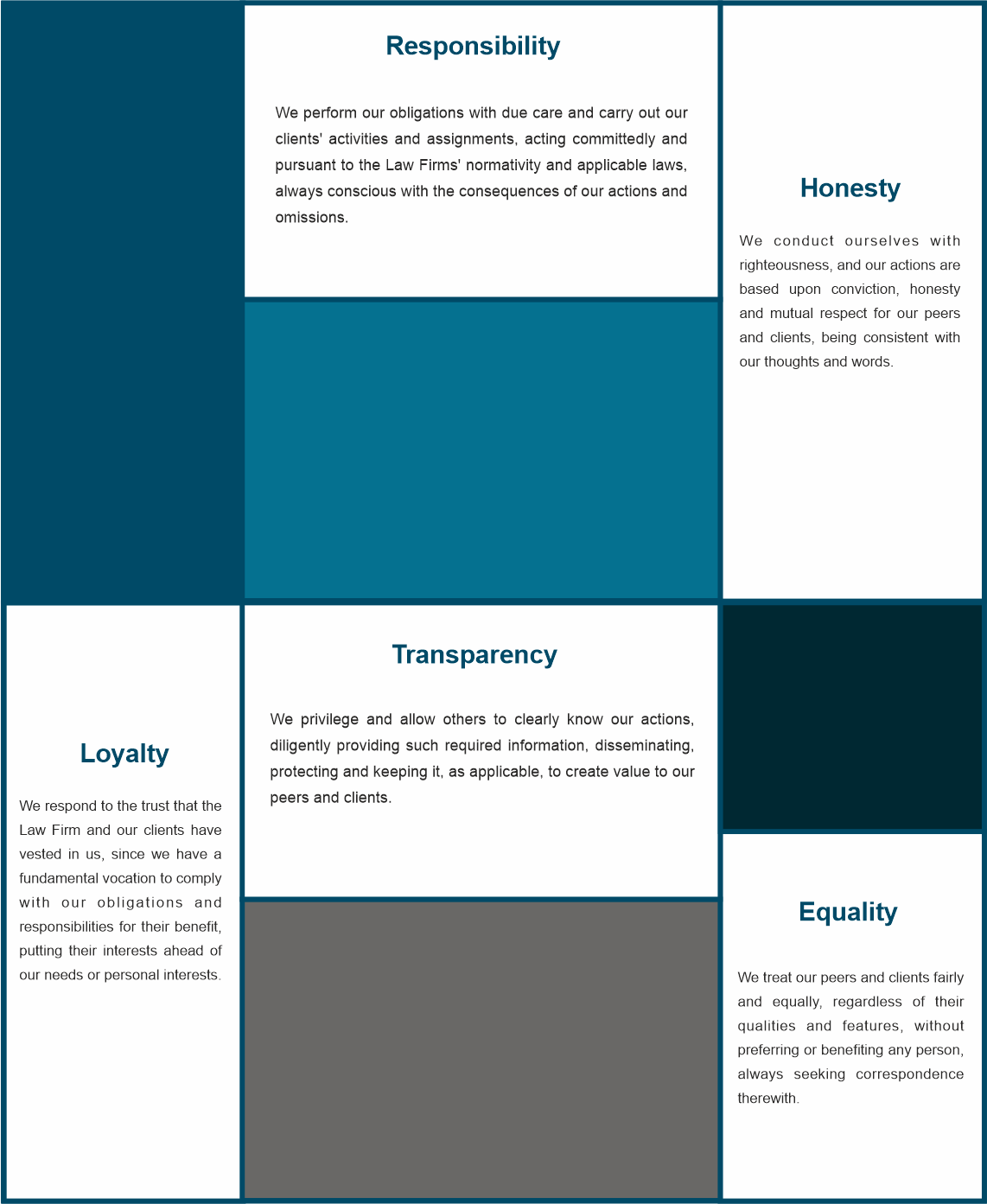 We perform our obligations with due care and carry out our clients’ activities and assignments, acting committedly and pursuant to the Law Firms’ normativity and applicable laws, always conscious with the consequences of our actions and omissions.